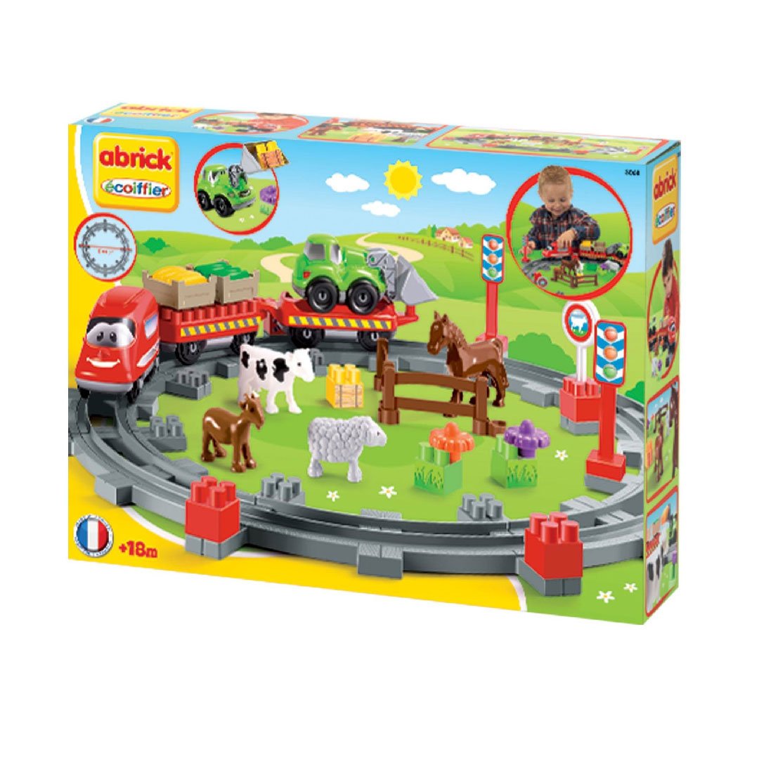 Un circuito ferroviario i cui binari sono fissati con i mattoncini, su cui corre un treno che tira 2 vagoni per rifornire i 4 animali inclusi nella confezione.